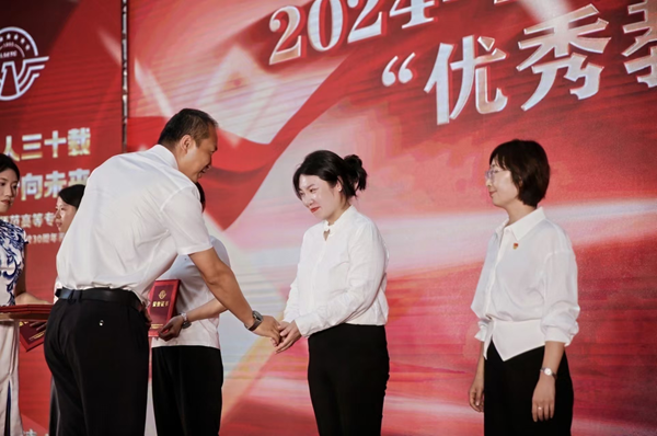 朱天旭副校长宣布于慧川等7人获2024-2025学年度“优秀教师”荣誉,金东烈副校长为其颁发证书,学生代表向老师献花致敬。朱天旭副校长鼓励教职工以优秀教师为榜样,见贤思齐、追求卓越,为特殊教育事业发展贡献更多力量。