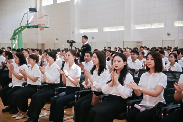大会第四篇章举行了新教工入职仪式。纪委书记郭丽华开展廉政谈话,要求新教工加强理论学习、坚守育人初心、严守纪律底线、自觉接受监督。随后,8名新教工上台庄严宣誓,展现出新一代“特教”人接过使命、奋勇前行的决心与信心。