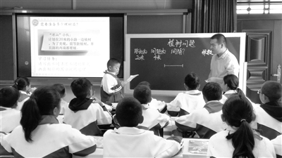 图为太原市实验小学数学教师赵江与北城小学学生研究“植树问题”。