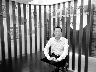 李维兵在学校剪纸艺术文化墙边留影。 张瑞波 供图